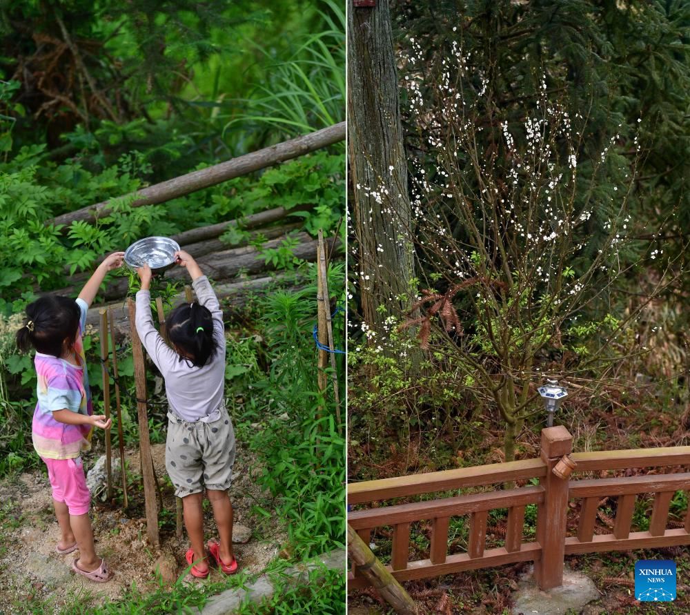 This combo photo shows children water saplings on June 20, 2020 (L) and the same tree blossoming on March 10, 2024 in Wuying Village on the border between south China's Guangxi Zhuang Autonomous Region and southwest China's Guizhou Province. Wuying Village is a Miao ethnic group hamlet that nestles snugly in the towering mountains stretching across the border between Guangxi and Guizhou.