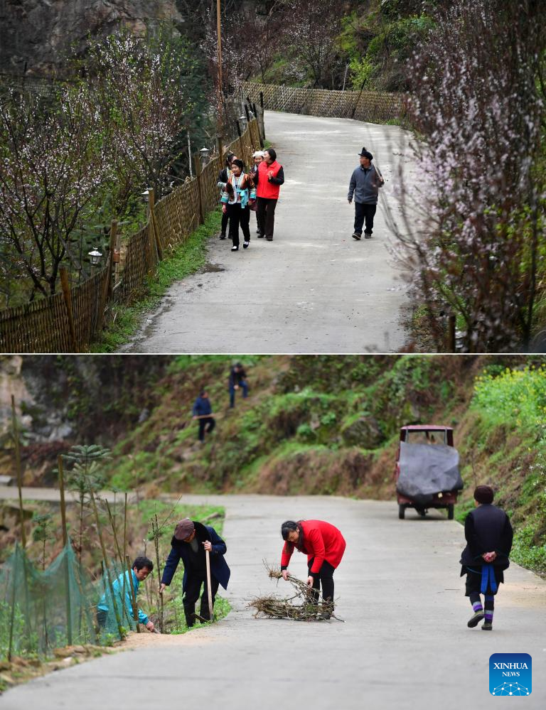 This combo photo shows blossoming fruit trees on March 9, 2024 (up) and villagers and volunteers planting trees along a road on March 3, 2020 in Wuying Village on the border between south China's Guangxi Zhuang Autonomous Region and southwest China's Guizhou Province. Wuying Village is a Miao ethnic group hamlet that nestles snugly in the towering mountains stretching across the border between Guangxi and Guizhou.