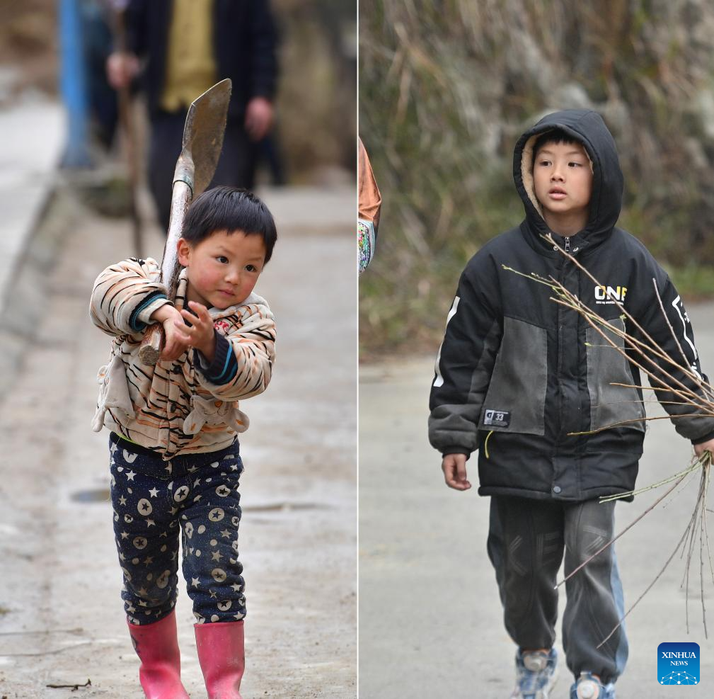 This combo photo shows 5-year-old Wu Liangyou carrying a shovel and following adults to plant trees on March 15, 2019 (L) and 10-year-old Wu Liangyou carrying saplings and following adults to plant trees on March 9, 2024 in Wuying Village on the border between south China's Guangxi Zhuang Autonomous Region and southwest China's Guizhou Province. Wuying Village is a Miao ethnic group hamlet that nestles snugly in the towering mountains stretching across the border between Guangxi and Guizhou.