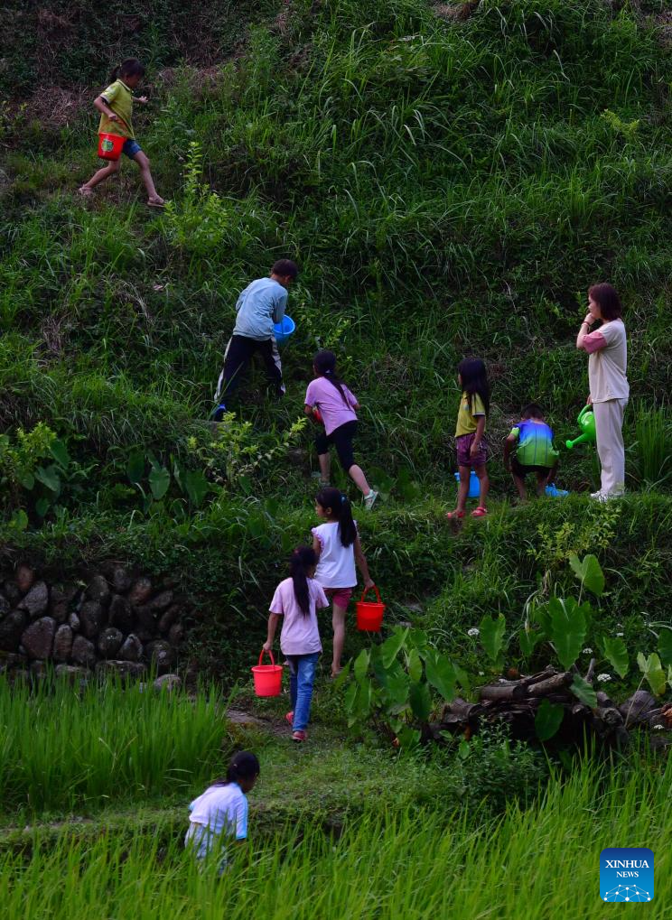 College student Pan Muzhi (1st R) and primary school students water the saplings in Wuying Village on the border between south China's Guangxi Zhuang Autonomous Region and southwest China's Guizhou Province, July 14, 2021. Wuying Village is a Miao ethnic group hamlet that nestles snugly in the towering mountains stretching across the border between Guangxi and Guizhou.