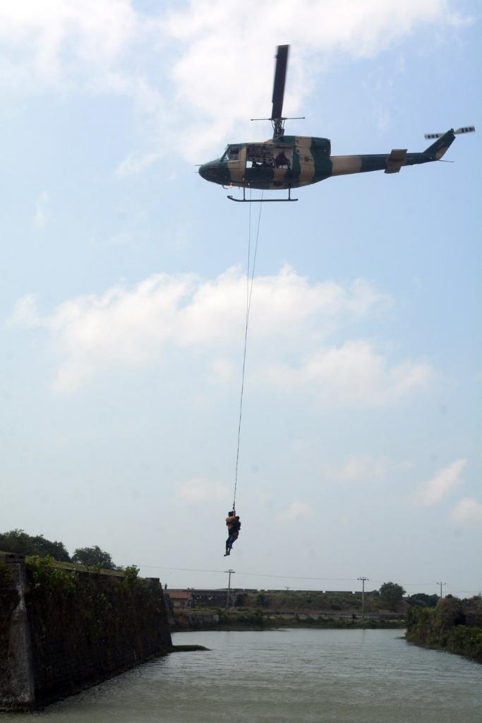 A rescue exercise is displayed during the "Air Tattoo - 2024" technological and educational exhibition in Jaffna, Sri Lanka, on March 9, 2024. (Photo by Gayan Sameera/Xinhua)
