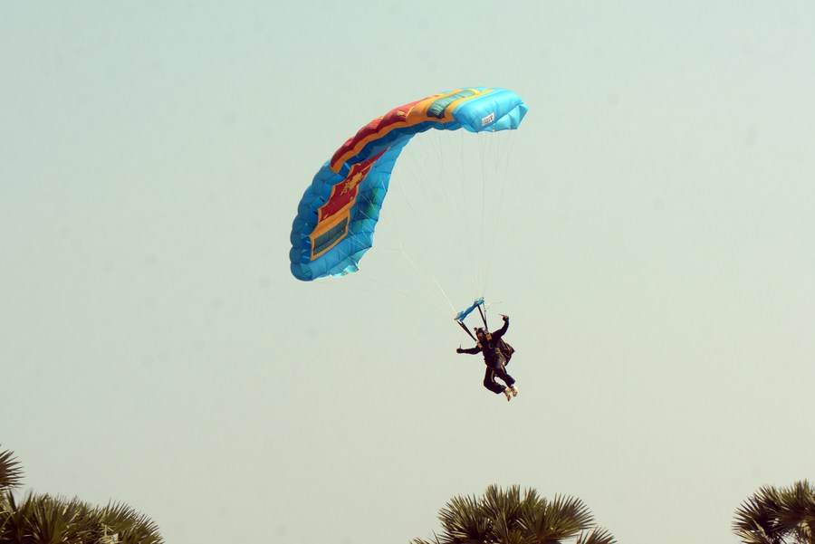 A paratrooper participates in the "Air Tattoo - 2024" technological and educational exhibition in Jaffna, Sri Lanka, on March 9, 2024. (Photo by Gayan Sameera/Xinhua)