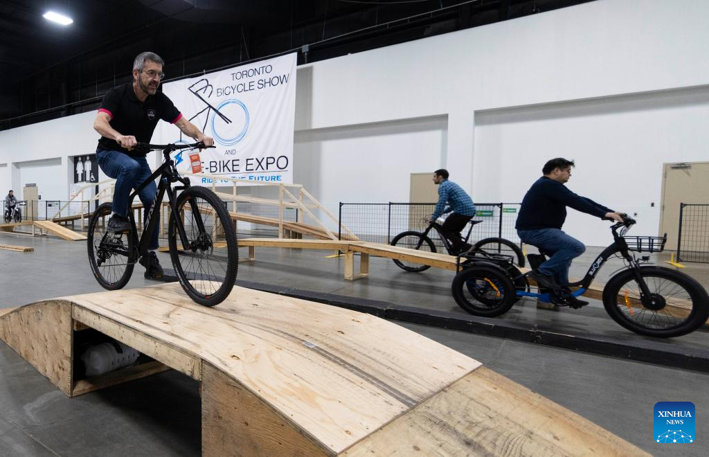 People take test rides during the 2024 Toronto Bicycle Show and E-Bike Expo in Mississauga, the Greater Toronto Area, Canada, March 10, 2024. This annual event was held here from March 8 to 10, showcasing the latest products of more than 170 exhibitors. (Photo by Zou Zheng/Xinhua)