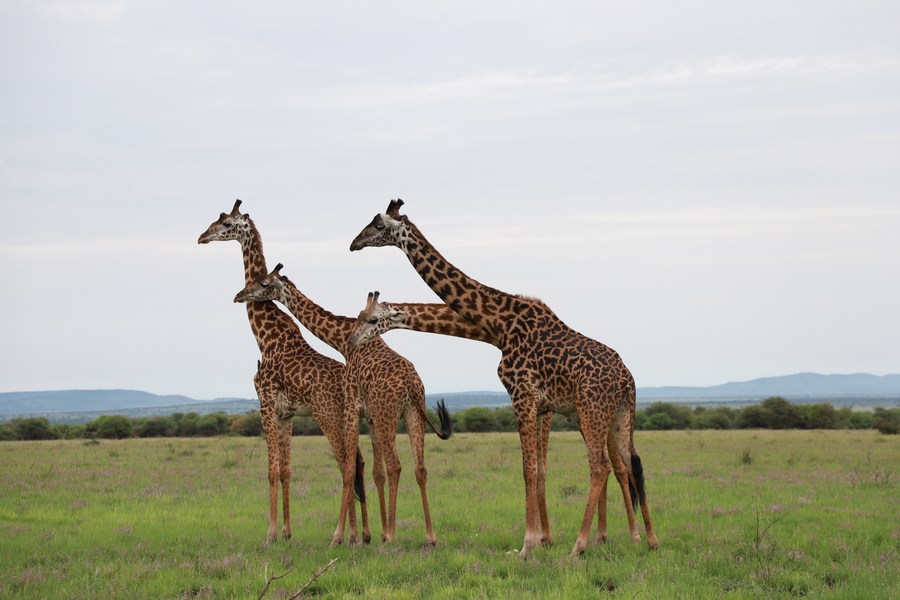 Giraffes are seen at Serengeti National Park in Tanzania, Feb. 12, 2022. (Photo by Cao Jingmin/Xinhua)