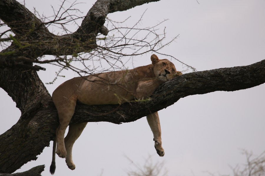 A lion rests on a tree at Serengeti National Park in Tanzania, Feb. 10, 2022. (Xinhua/Xie Hao)