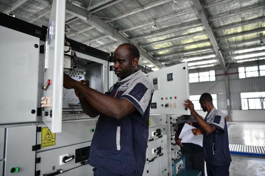 Employees work at a workshop of an electric equipment company in the Lekki Free Trade Zone in Lagos, Nigeria, March 1, 2024. (Xinhua/Han Xu)