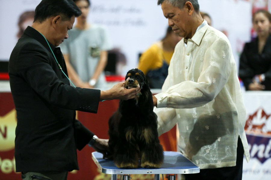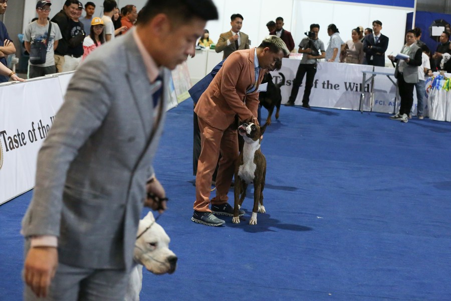 A judge checks a pet dog at a pet expo in Yangon, Myanmar, March 10, 2024. (Photo by Myo Kyaw Soe/Xinhua)