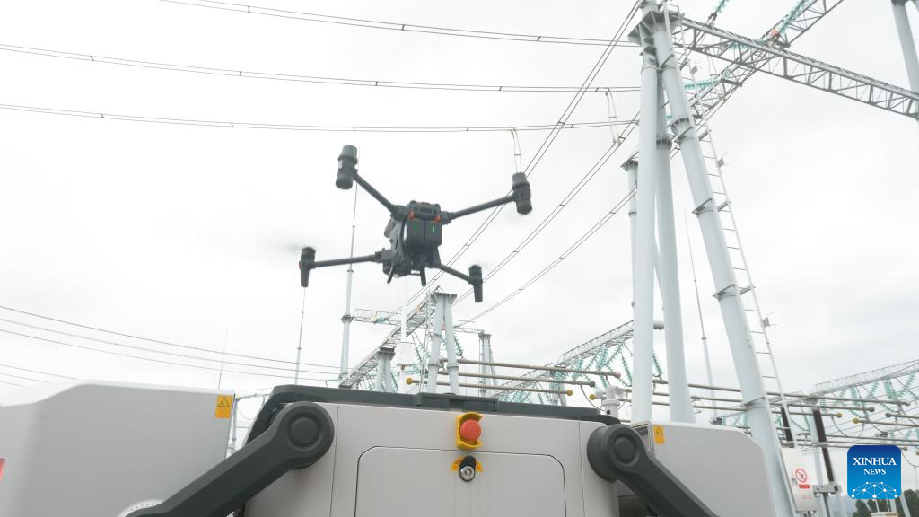 This photo taken on Feb. 22, 2024 shows a drone conducting artificial intelligence (AI) inspection work at a power substation in Baoshan, southwest China's Yunnan Province. China's southwestern province of Yunnan has deployed artificial intelligence (AI) to carry out most routine inspections at 621 power substations, replacing the need for human interventions.(Xinhua)