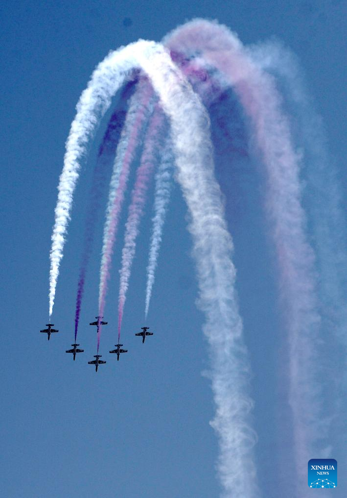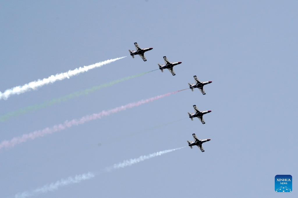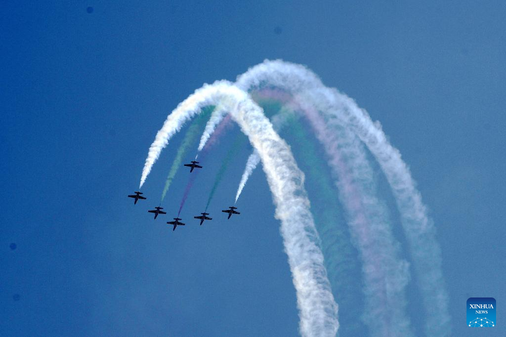 Pakistani fighter jets perform aerobatic maneuvers during a rehearsal for an upcoming Pakistan Day military parade in Islamabad, capital of Pakistan, March 12, 2024. Pakistan Day, also known as the Pakistan Resolution Day or Republic Day, is observed every March 23. The day is celebrated annually to mark the passing of the Lahore Resolution on March 23, 1940, which is a major milestone in the struggle for an independent state. (Xinhua/Ahmad Kamal)