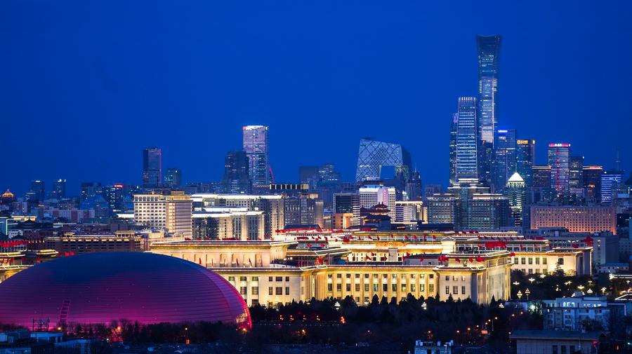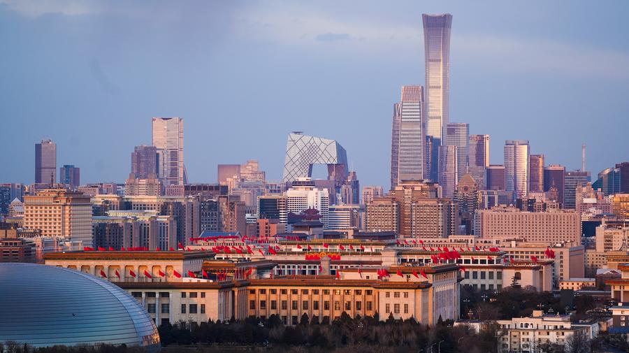 BEIJING, March 12 (Xinhua) -- Stunning views of the Great Hall of the People, with the skyline of Beijing in the background, were captured at twilight on Monday. Located on the western edge of Tian'anmen Square, the Great Hall of the People is among the structures built in the Chinese capital to commemorate the 10th anniversary of the founding of the People's Republic of China in 1959.