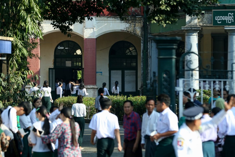 Students enter a high school for the matriculation exam for the academic year 2023-24 in Yangon, Myanmar, March 11, 2024. (Photo by Myo Kyaw Soe/Xinhua)