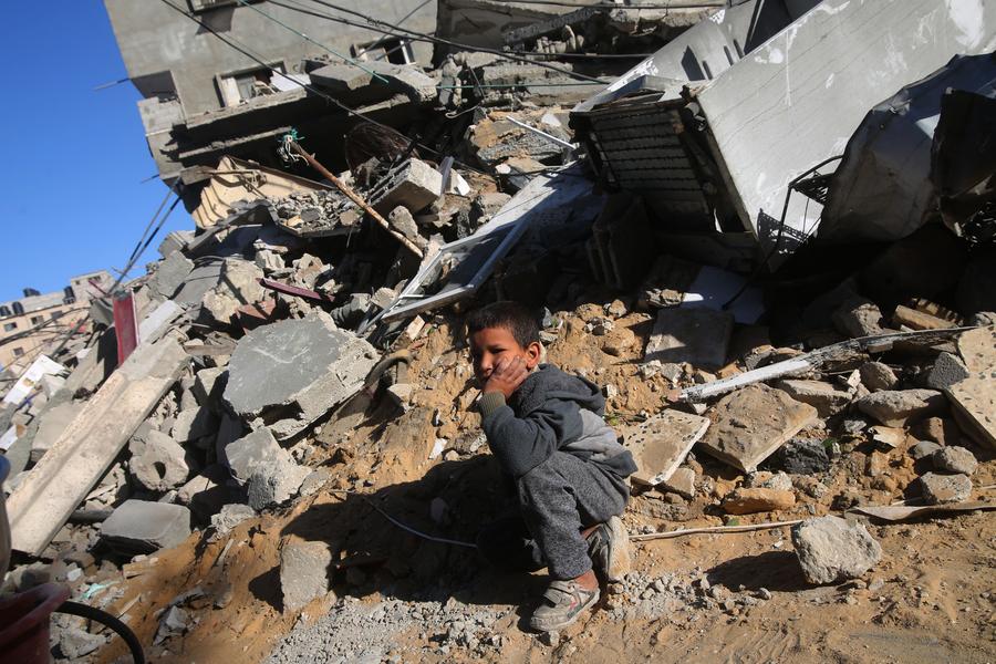 A boy sits on the rubble in the southern Gaza Strip city of Rafah, on March 12, 2024. (Photo by Khaled Omar/Xinhua)