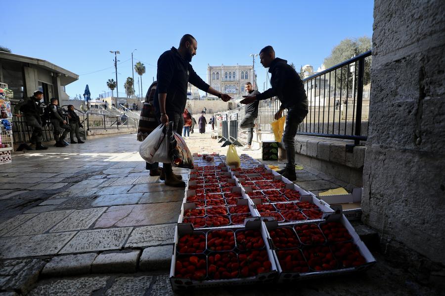 Palestinian people shop as Israeli border police stand guard during Ramadan in Jerusalem's Old City, on March 11, 2024. (Photo by Jamal Awad/Xinhua)