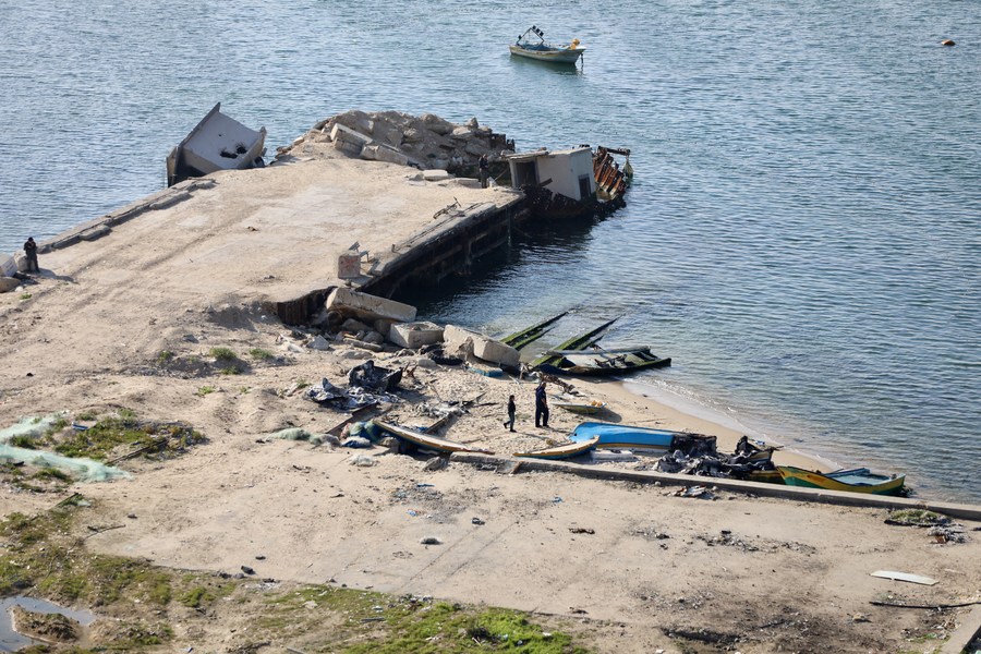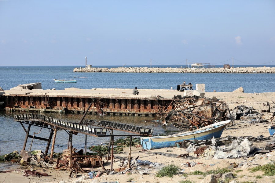 This photo taken on Feb. 20, 2024 shows a damaged port in Gaza City. (Photo by Mohammed Ali/Xinhua)