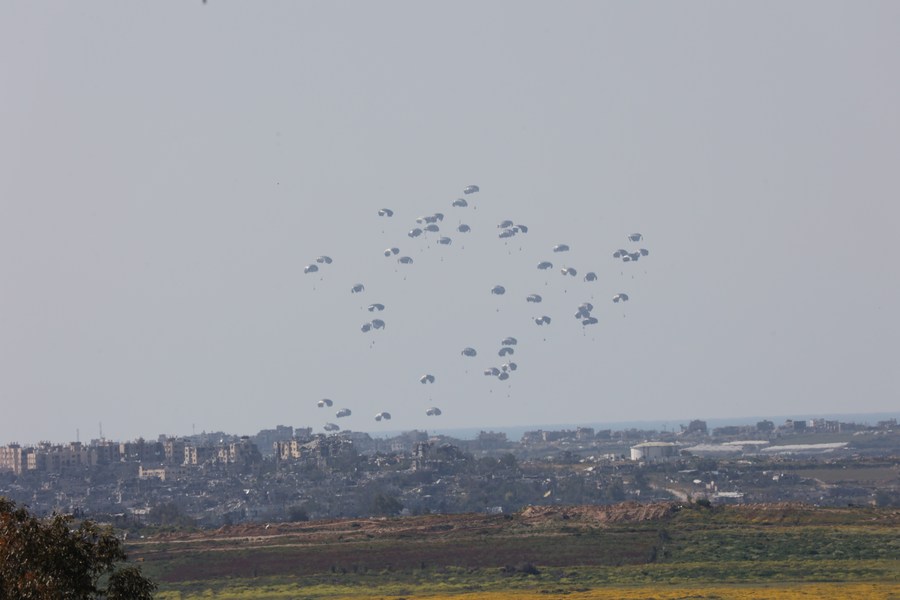 Humanitarian aids are airdropped to the Gaza Strip in this photo taken near the southern Israeli city of Sderot on March 11, 2024. (Photo by Gil Cohen Magen/Xinhua) ■