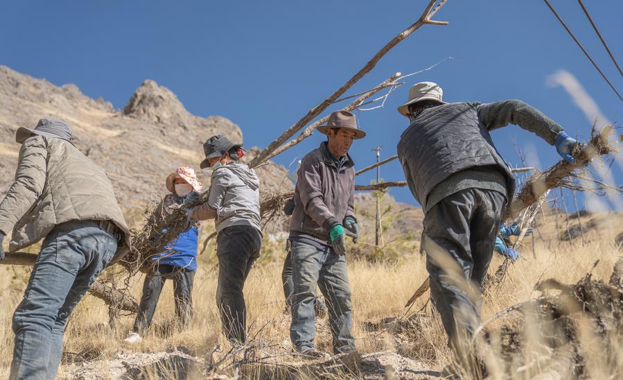 Villagers of the Donggar community transfer saplings in Lhasa, southwest China's Xizang Autonomous Region, March 12, 2024. (Xinhua/Jigme Dorje)
