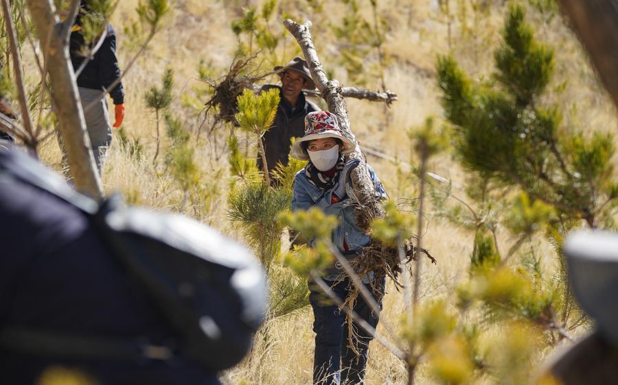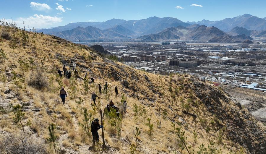 LHASA, March 13 (Xinhua) -- In Doilungdeqen District of Lhasa, more than 90 villagers of the Donggar community gathered on Xiga Mountain Tuesday to earth up saplings. They planned to plant about 2,000 saplings on this day.
