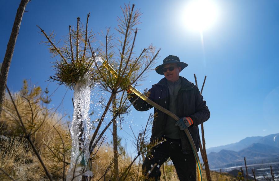 An aerial drone photo taken on March 12, 2024 shows trees planted on Xiga Mountain in Lhasa, southwest China's Xizang Autonomous Region. (Xinhua/Tian Jinwen)Villagers of the Donggar community transfer saplings in Lhasa, southwest China's Xizang Autonomous Region, March 12, 2024. (Xinhua/Tian Jinwen)Rigzin, a group leader in the Donggar community, checks the growth of saplings in Lhasa, southwest China's Xizang Autonomous Region, March 12, 2024. (Xinhua/Jigme Dorje)Villagers of the Donggar community plant saplings in Lhasa, southwest China's Xizang Autonomous Region, March 12, 2024. (Xinhua/Jigme Dorje)An aerial drone photo taken on March 12, 2024 shows villagers of the Donggar community planting saplings in Lhasa, southwest China's Xizang Autonomous Region. (Xinhua/Jigme Dorje)A villager of the Donggar community waters saplings in Lhasa, southwest China's Xizang Autonomous Region, March 12, 2024. (Xinhua/Tenzin Nyida)Villagers of the Donggar community transfer saplings in Lhasa, southwest China's Xizang Autonomous Region, March 12, 2024. (Xinhua/Tian Jinwen)Villagers of the Donggar community transfer saplings by cableway in Lhasa, southwest China's Xizang Autonomous Region, March 12, 2024. (Xinhua/Jigme Dorje)A villager of the Donggar community waters saplings in Lhasa, southwest China's Xizang Autonomous Region, March 12, 2024. (Xinhua/Jigme Dorje)This photo taken in October 2004 shows a view of the Donggar community and the barren mountain around the community in Lhasa, southwest China's Xizang Autonomous Region. (Xinhua)■