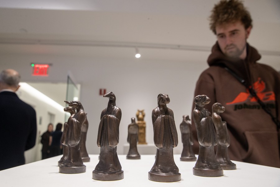 A visitor looks at Chinese sculptor Liu Shiming's works at the Liu Shiming Art Gallery in New York, the United States, March 12, 2024. (Photo by Yu Zheng/Xinhua)