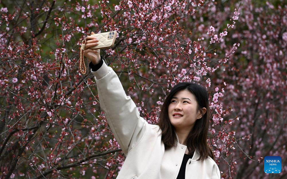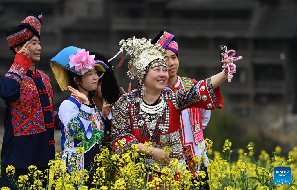 A tourist takes a selfie at the Wujiangzhai scenic spot in Zunyi, southwest China's Guizhou Province, March 14, 2024. The Wujiangzhai scenic spot, with its natural landscape and local folk customs, offers a blend of sightseeing, leisure activities and exhibitions, making it a popular destination for tourists. (Xinhua/Yang Ying)