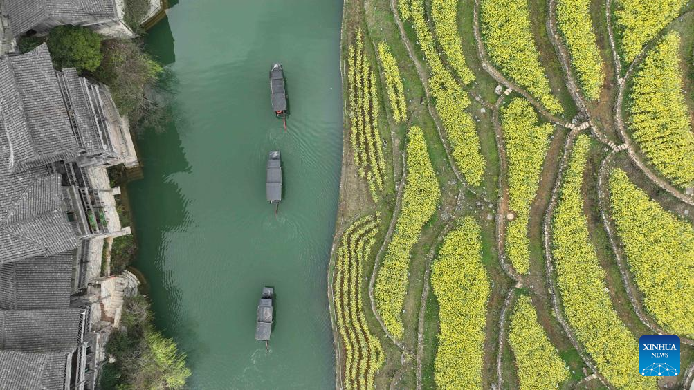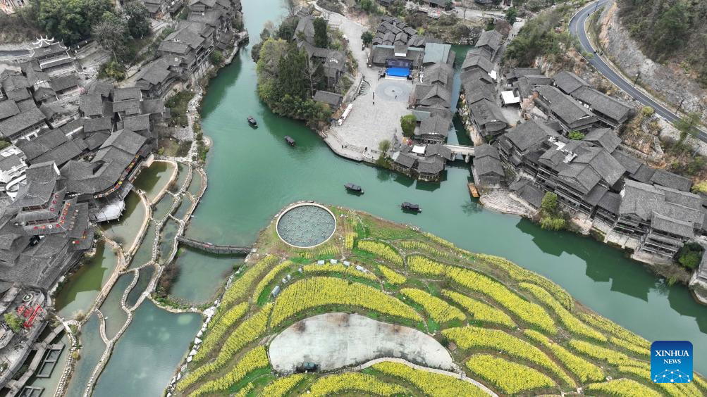 An aerial drone photo shows a view of the Wujiangzhai scenic spot in Zunyi, southwest China's Guizhou Province, March 14, 2024. The Wujiangzhai scenic spot, with its natural landscape and local folk customs, offers a blend of sightseeing, leisure activities and exhibitions, making it a popular destination for tourists. (Xinhua/Yang Ying)