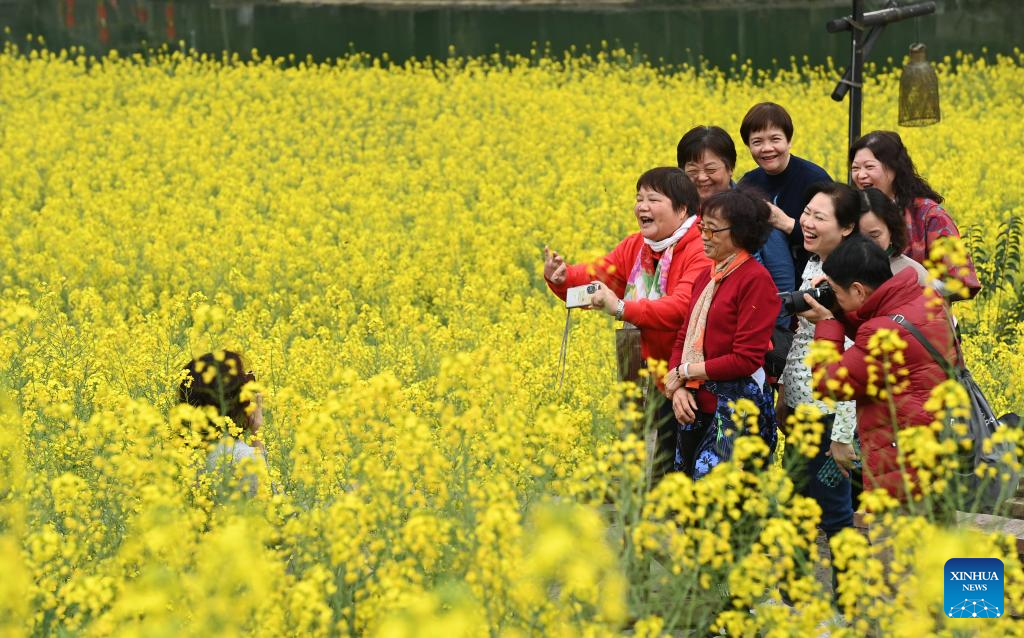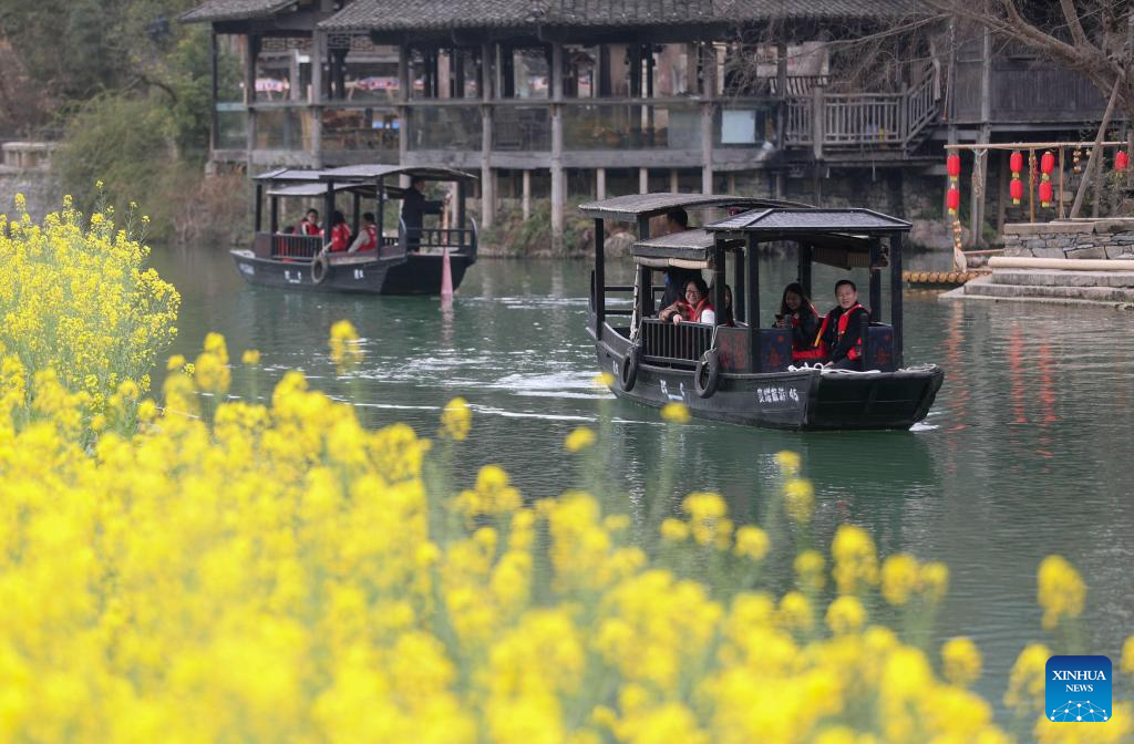 Tourists visit the Wujiangzhai scenic spot in Zunyi, southwest China's Guizhou Province, March 14, 2024. The Wujiangzhai scenic spot, with its natural landscape and local folk customs, offers a blend of sightseeing, leisure activities and exhibitions, making it a popular destination for tourists. (Xinhua/Yang Ying)