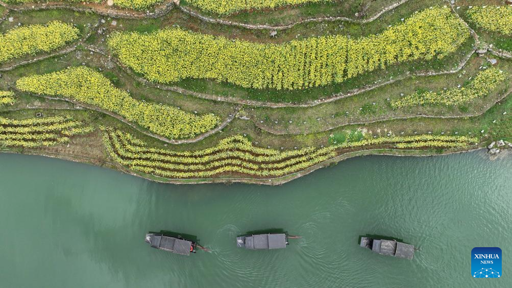 Tourists take boats at the Wujiangzhai scenic spot in Zunyi, southwest China's Guizhou Province, March 14, 2024. The Wujiangzhai scenic spot, with its natural landscape and local folk customs, offers a blend of sightseeing, leisure activities and exhibitions, making it a popular destination for tourists. (Photo by Yuan Fuhong/Xinhua)