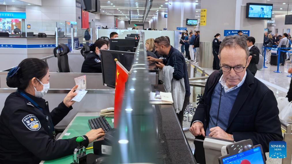 Border police officers check documents of travelers at a border checkpoint of the Shanghai Pudong International Airport in east China's Shanghai, March 14, 2024. (Photo by Wei Wenheng/Xinhua)