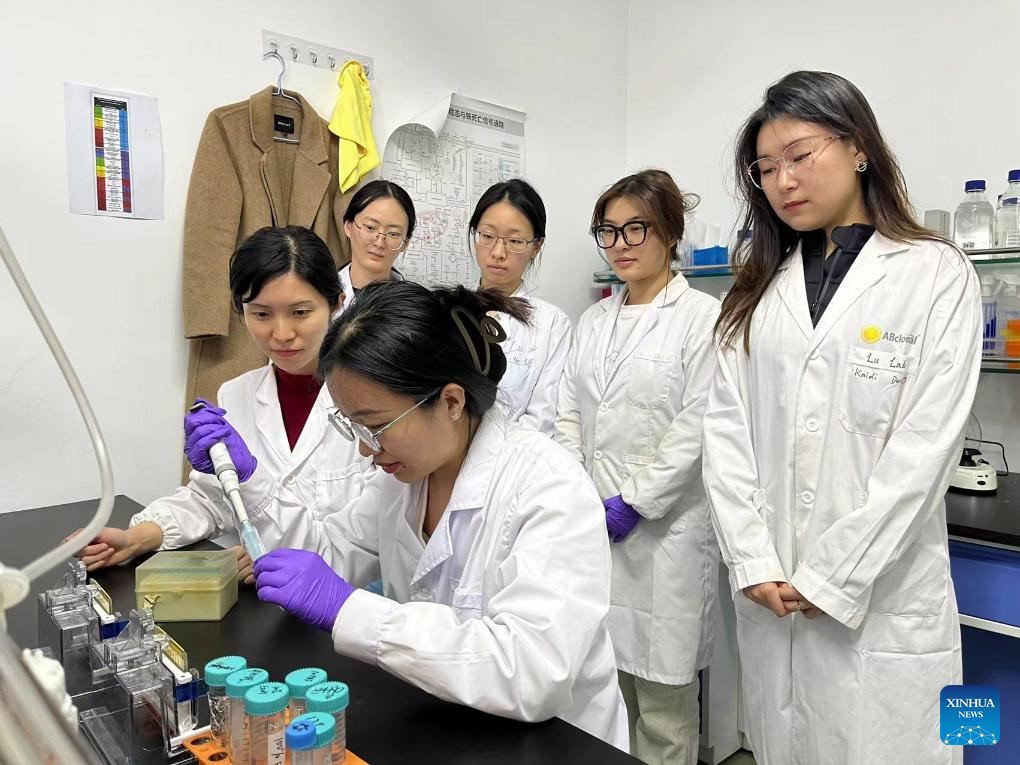 Researchers from the School of Life Sciences of Tianjin University conduct an experiment at a laboratory in north China's Tianjin, March 15, 2024. (Xinhua)