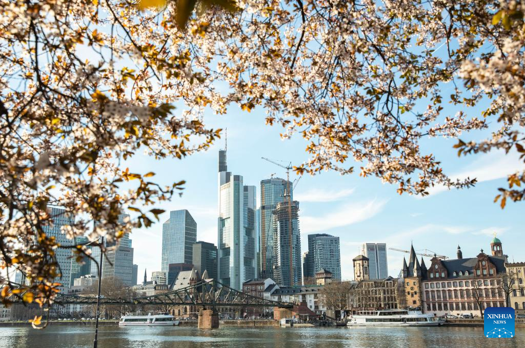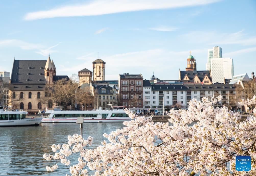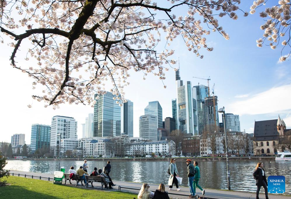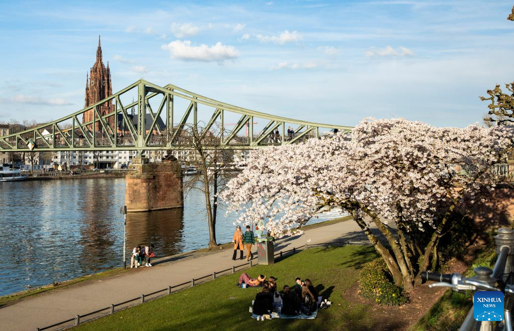 People enjoy leisure time under blossoming trees at the bank of the Main River in Frankfurt, Germany, March 14, 2024. (Xinhua/Zhang Fan)