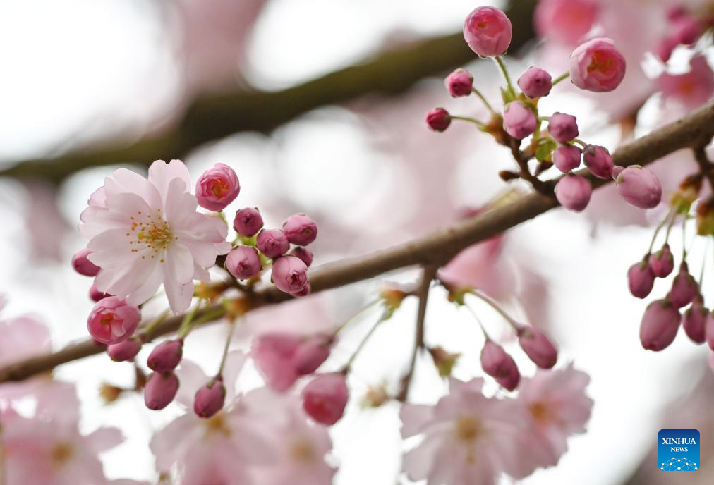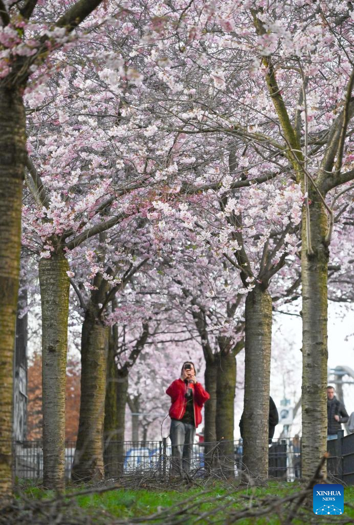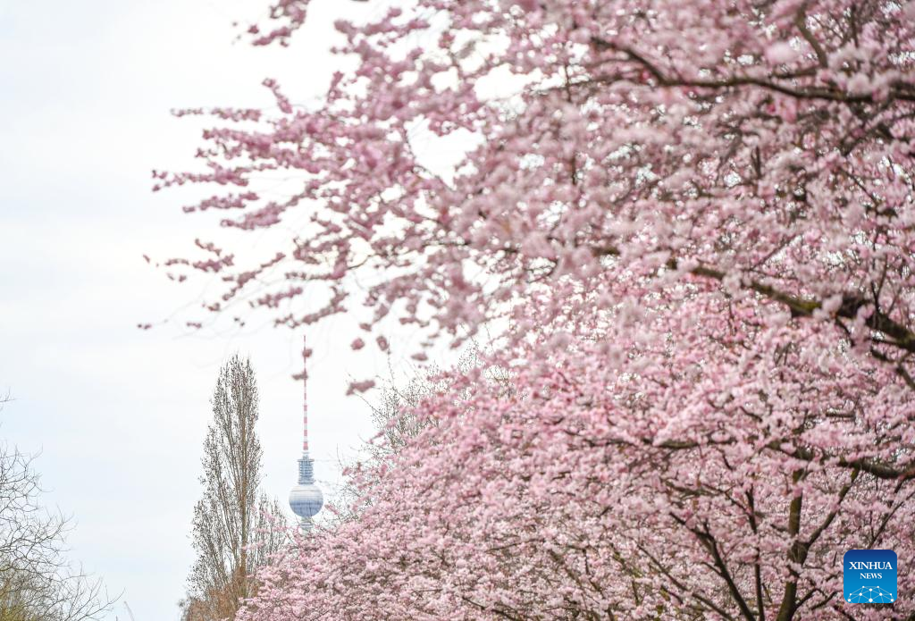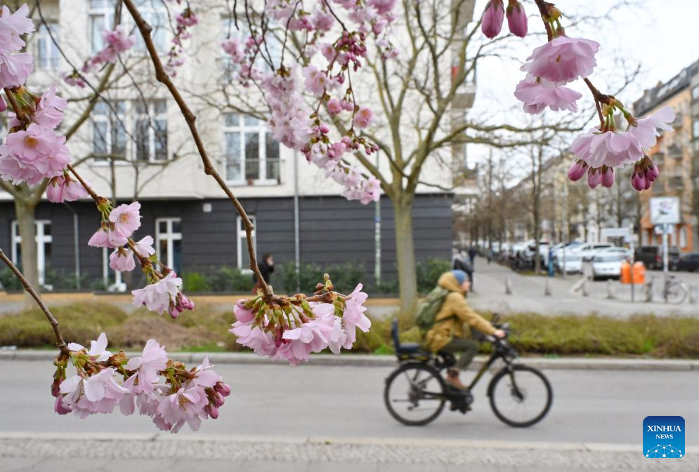 This photo taken on March 14, 2024 shows cherry blossoms in Berlin, Germany. (Xinhua/Ren Pengfei)