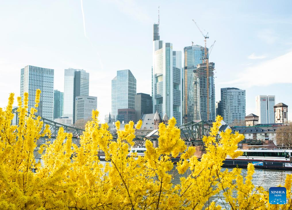 This photo taken on March 14, 2024 shows flowers at the bank of Main River in Frankfurt, Germany. (Xinhua/Zhang Fan)