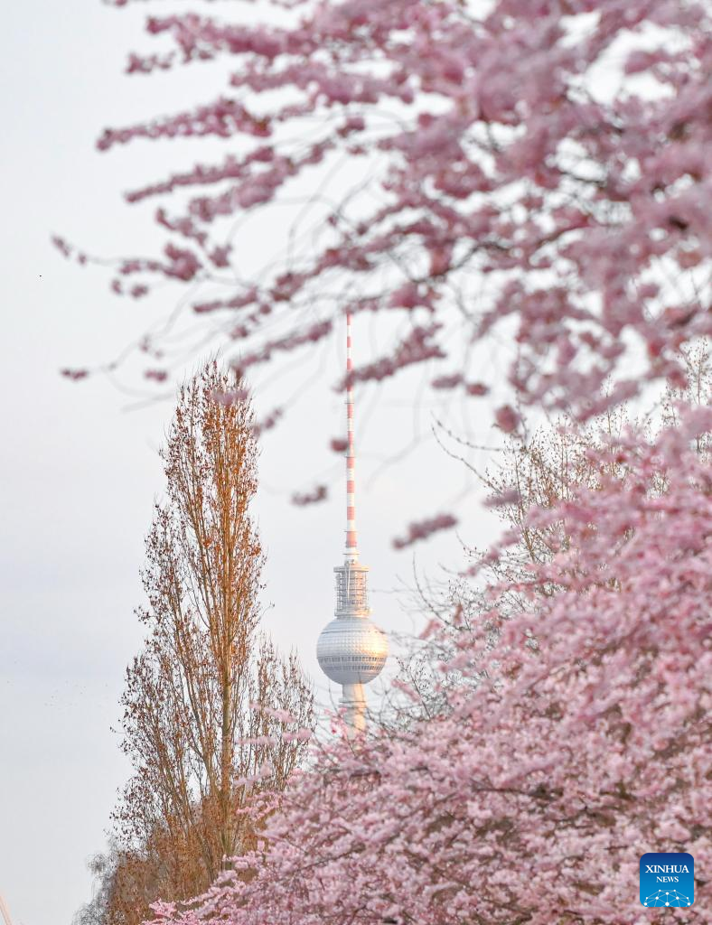 This photo taken on March 14, 2024 shows cherry blossoms with the TV Tower in the distance in Berlin, Germany. (Xinhua/Ren Pengfei)