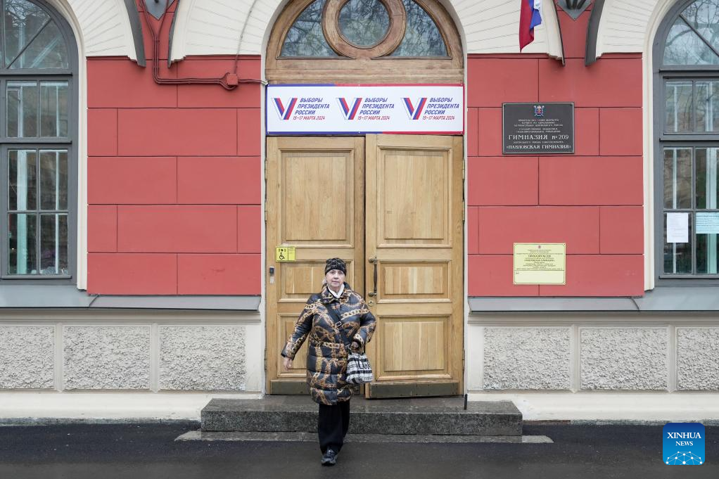 A voter leaves a polling station in St. Petersburg, Russia, March 15, 2024.