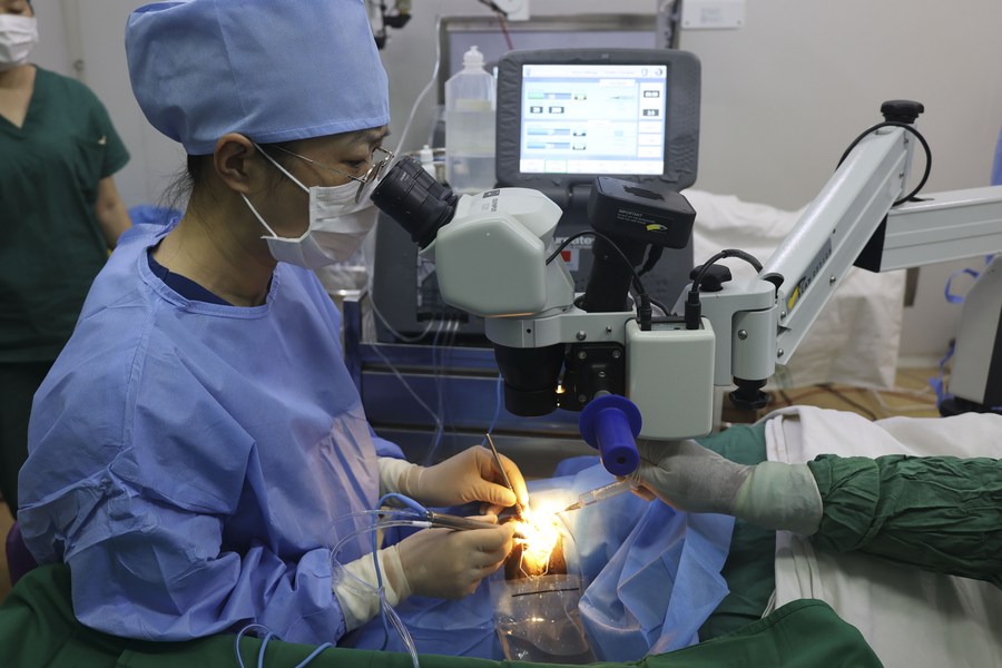 A Chinese doctor performs surgery on a local cataract patient at the LEKMA Hospital in Accra, capital of Ghana, Sept. 20, 2023. (Photo by Seth/Xinhua)