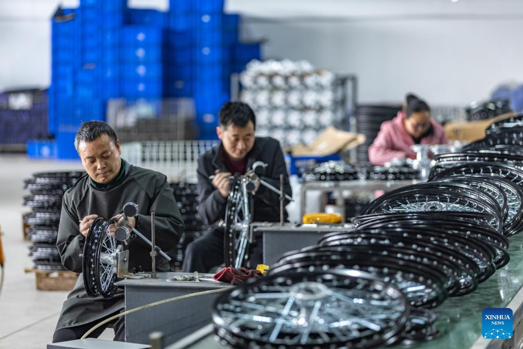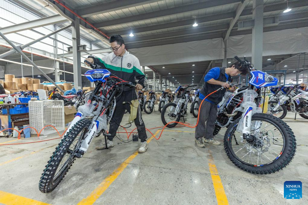 Workers test motorcycles at the Chongqing Hawe New Energy Co., Ltd. in Bishan District of Chongqing, southwest China, March 15, 2024. The products of the company will be transported to Europe via China-Europe freight train service. Benefiting from the increase of train trips and the launch of new freight train routes, including two direct rail routes to Spain and Türkiye, the city of Chongqing has seen increase in its export via China-Europe freight train service this year.