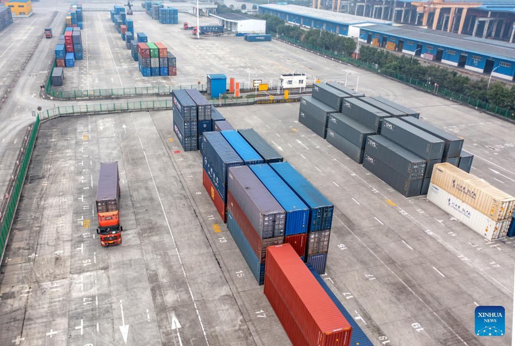 An aerial drone photo taken on March 7, 2024 shows containers waiting to go through customs clearance at a railway station in Chongqing, southwest China. Benefiting from the increase of train trips and the launch of new freight train routes, including two direct rail routes to Spain and Türkiye, the city of Chongqing has seen increase in its export via China-Europe freight train service this year.