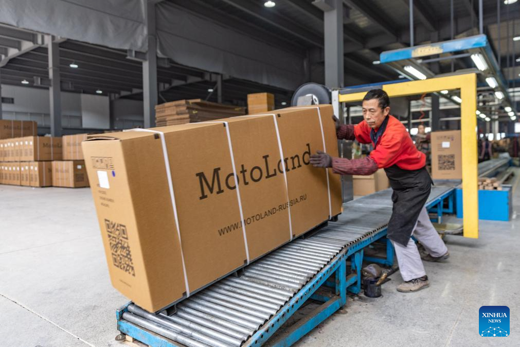 A worker carried a packaged motorcycle off a production line of Chongqing Hawe New Energy Co., Ltd. in Bishan District of Chongqing, southwest China, March 15, 2024. The products of the company will be transported to Europe via China-Europe freight train service. Benefiting from the increase of train trips and the launch of new freight train routes, including two direct rail routes to Spain and Türkiye, the city of Chongqing has seen increase in its export via China-Europe freight train service this year.