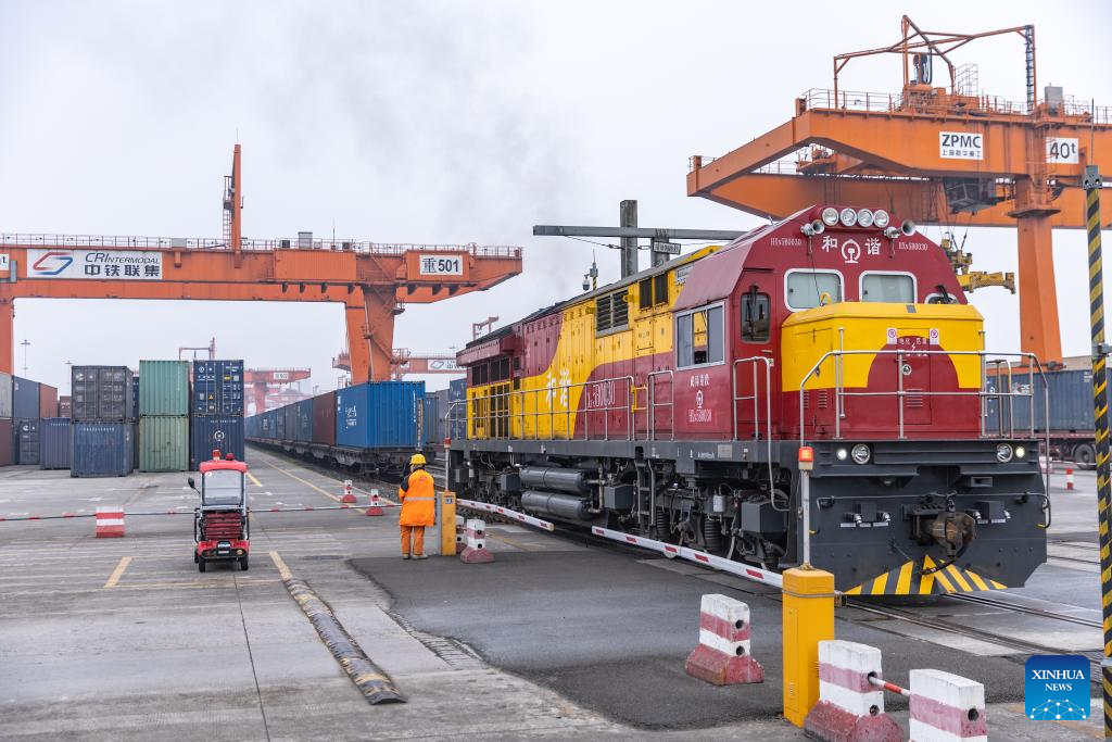 A China-Europe freight train loaded with machinery, automobiles and auto parts waits for departure at a railway station in Chongqing, southwest China, March 7, 2024. Benefiting from the increase of train trips and the launch of new freight train routes, including two direct rail routes to Spain and Türkiye, the city of Chongqing has seen increase in its export via China-Europe freight train service this year.