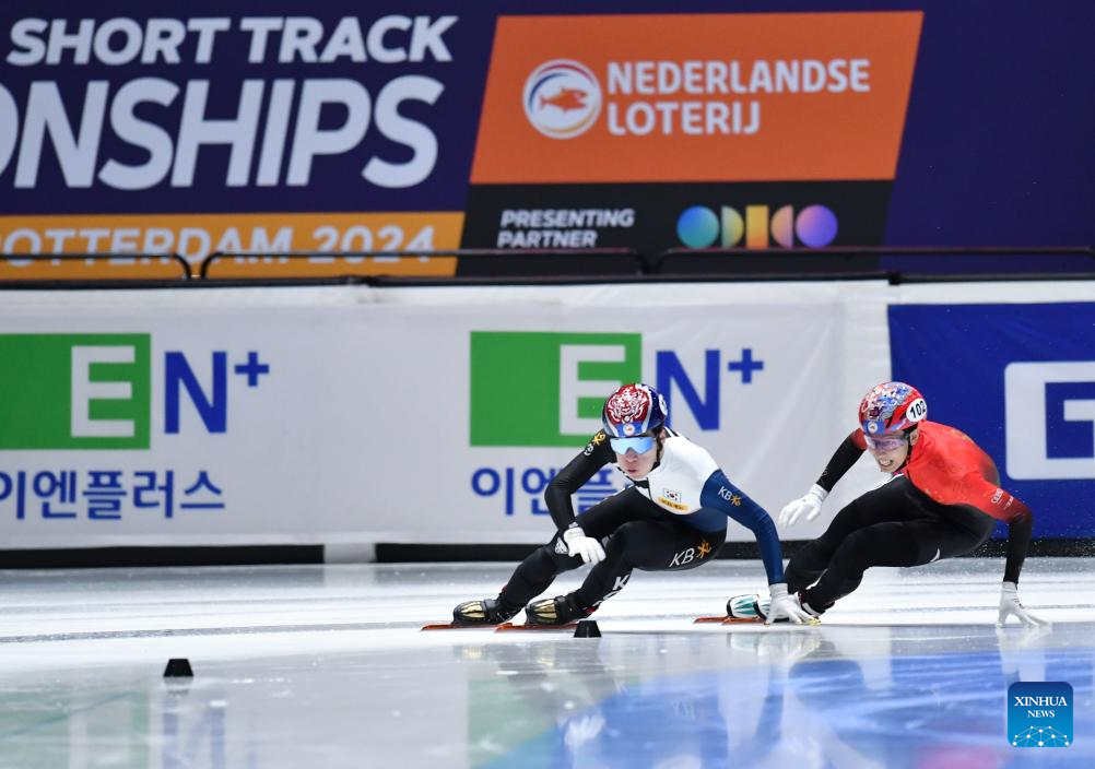 Hwang Daeheon (L) of South Korea and Sun Long of China compete during the men's 1500m final A at the ISU World Short Track Speed Skating Championships 2024 in Rotterdam, the Netherlands, March 16, 2024. (Xinhua/Lian Yi)