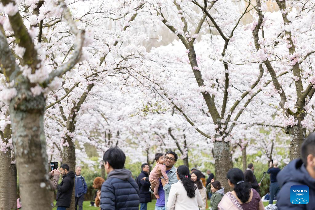 People enjoy their time under cherry blossoms in Amstelveen, the Netherlands, March 16, 2024. (Photo by Sylvia Lederer/Xinhua)