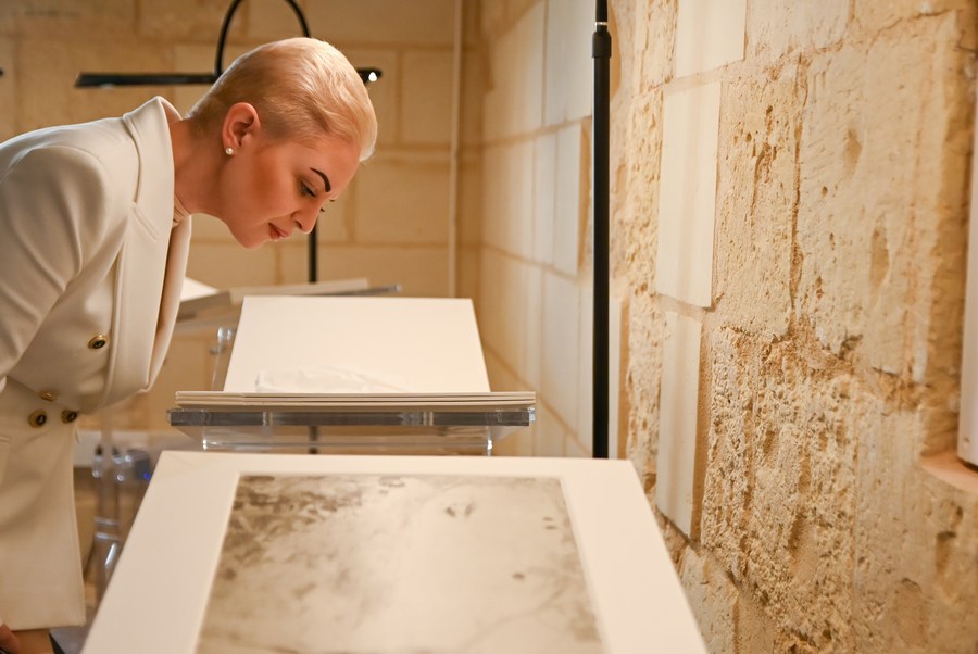 A woman views an artwork at the China Pavilion of the Malta Biennale in Valletta, Malta, on March 15, 2024. (Photo by Jonathan Borg/Xinhua)