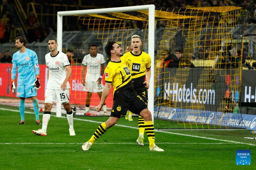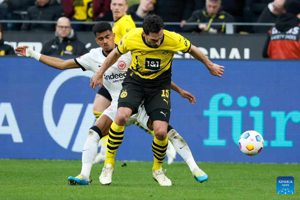 Mats Hummels (Front R) of Borussia Dortmund vies with Ansgar Knauff of Eintracht Frankfurt during the first division of Bundesliga match between Borussia Dortmund and Eintracht Frankfurt in Dortmund, Germany, on March 17, 2024. (Photo by Joachim Bywaletz/Xinhua)