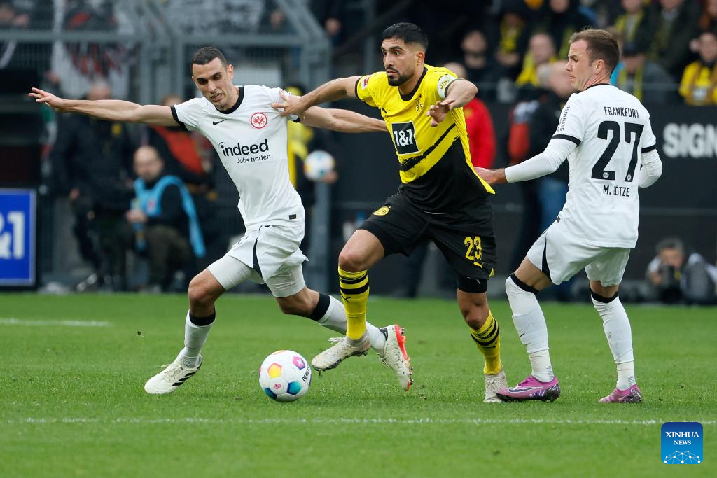Emre Can (C) of Borussia Dortmund vies with Ellyes Skhiri (L) and Mario Goetze of Eintracht Frankfurt during the first division of Bundesliga match between Borussia Dortmund and Eintracht Frankfurt in Dortmund, Germany, on March 17, 2024. (Photo by Joachim Bywaletz/Xinhua)