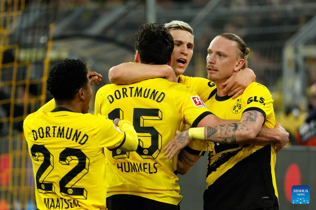 Mats Hummels (2nd,L) of Borussia Dortmund celebrates scoring with teammates during the first division of Bundesliga match between Borussia Dortmund and Eintracht Frankfurt in Dortmund, Germany, on March 17, 2024. (Photo by Joachim Bywaletz/Xinhua)
