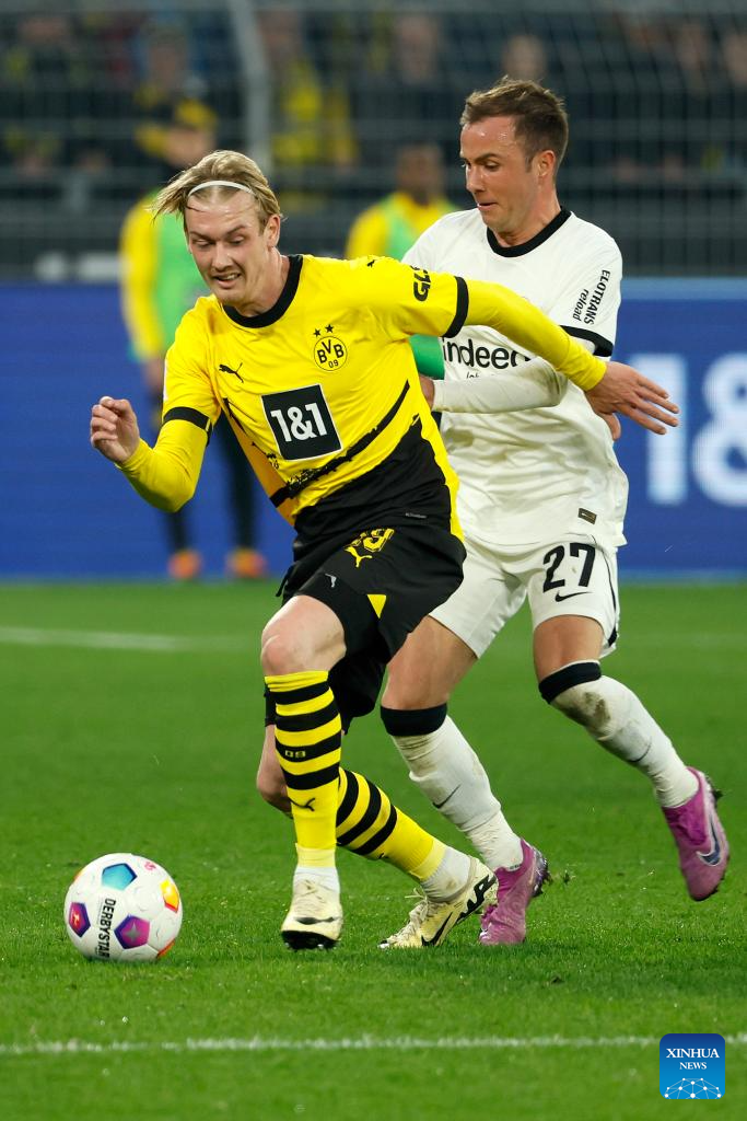 Julian Brandt (L) of Borussia Dortmund vies with Mario Goetze of Eintracht Frankfurt during the first division of Bundesliga match between Borussia Dortmund and Eintracht Frankfurt in Dortmund, Germany, on March 17, 2024. (Photo by Joachim Bywaletz/Xinhua)