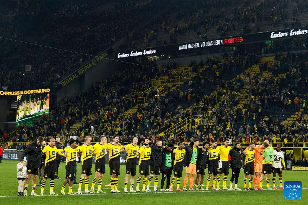 Players of Borussia Dortmund greet spectators after winning the first division of Bundesliga match between Borussia Dortmund and Eintracht Frankfurt in Dortmund, Germany, on March 17, 2024. (Photo by Joachim Bywaletz/Xinhua)