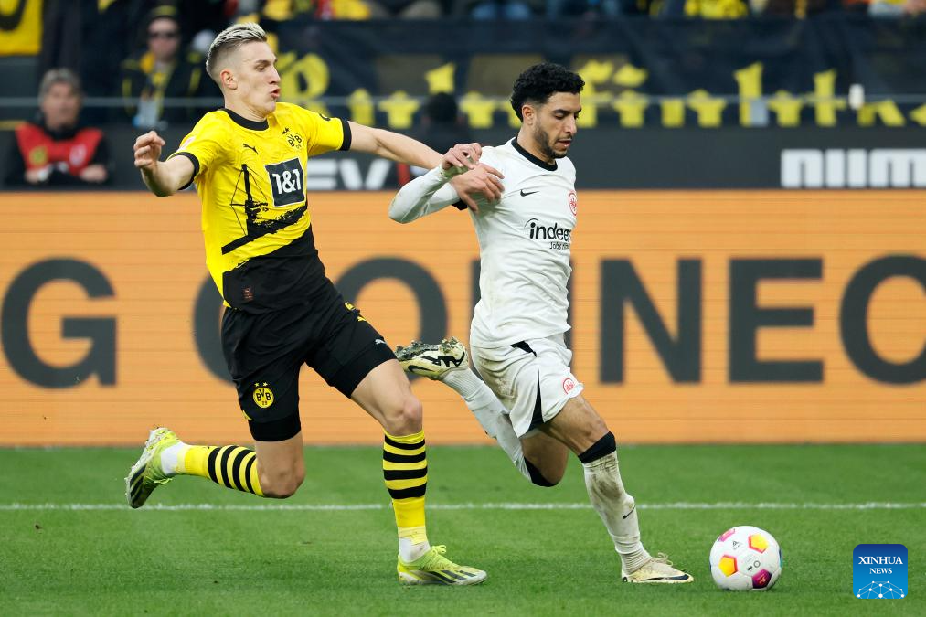 Nico Schlotterbeck (L) of Borussia Dortmund vies with Omar Marmoush of Eintracht Frankfurt during the first division of Bundesliga match between Borussia Dortmund and Eintracht Frankfurt in Dortmund, Germany, on March 17, 2024. (Photo by Joachim Bywaletz/Xinhua)
