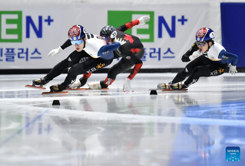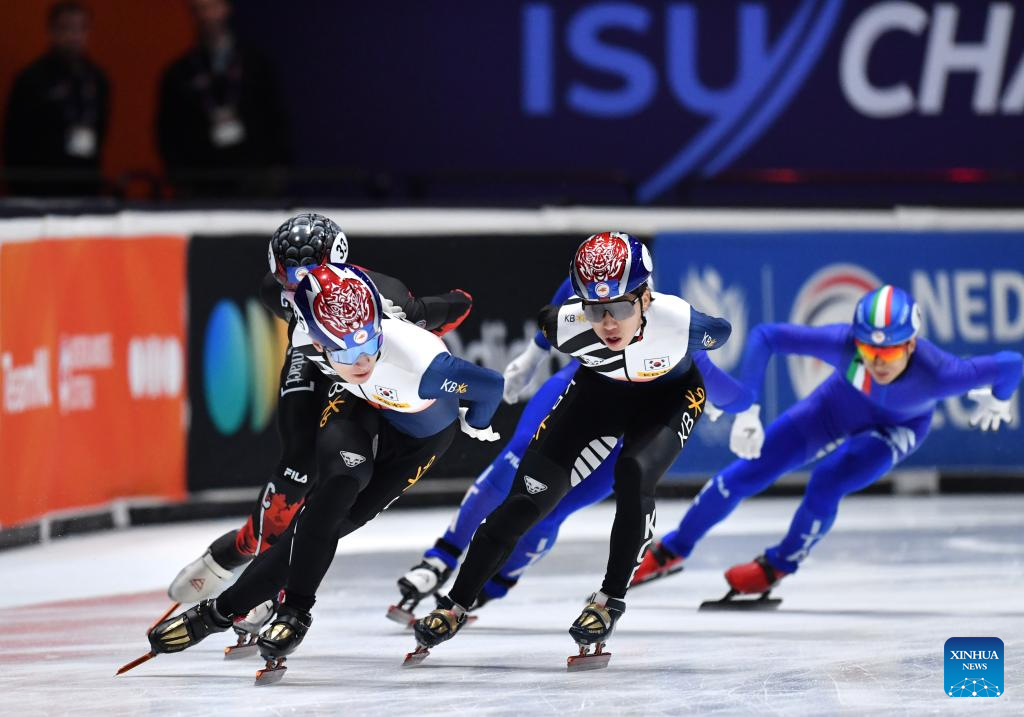 Hwang Dae Heon (1st L) of South Korea competes during the men's 1000m final A at the ISU World Short Track Speed Skating Championships 2024 in Rotterdam, the Netherlands, March 17, 2024. (Xinhua/Lian Yi)