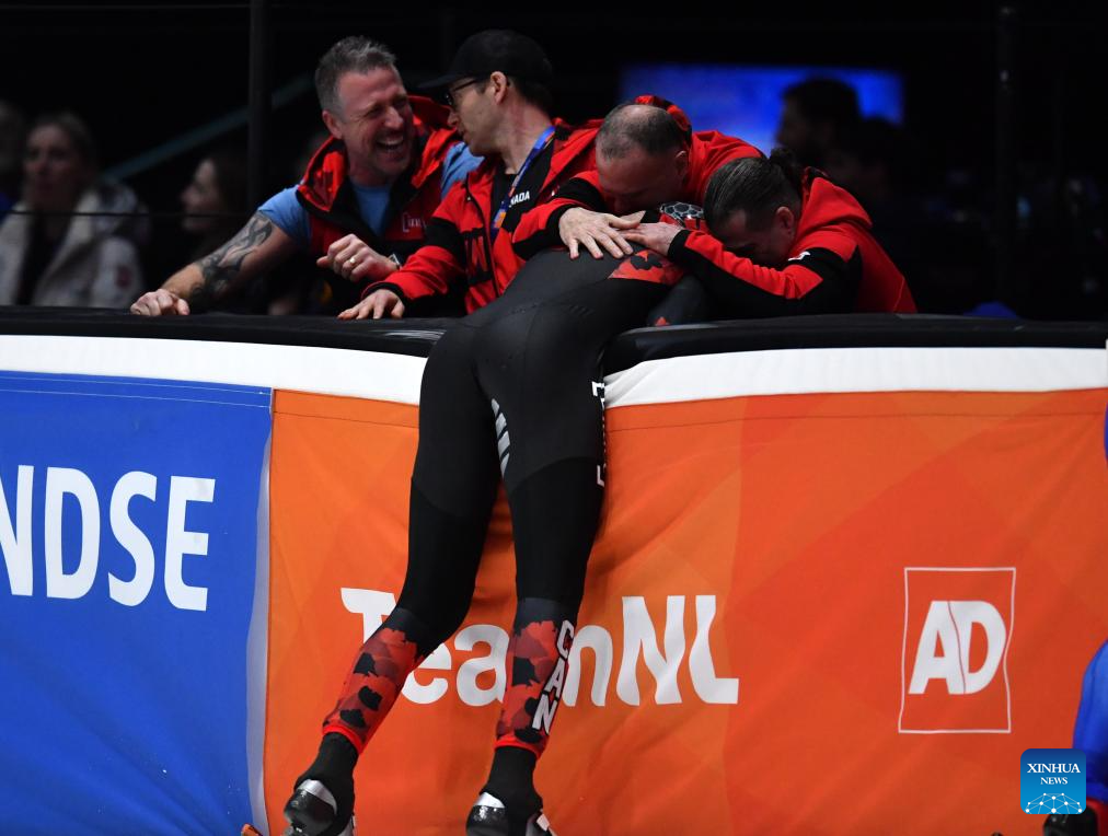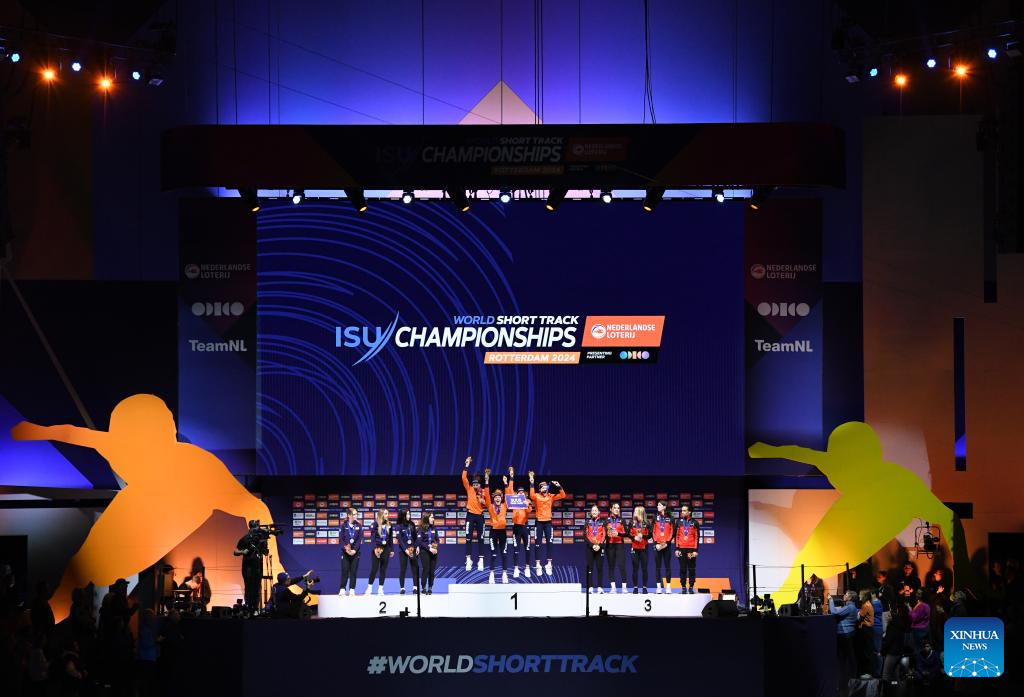 Gold medalists team the Netherlands (C), silver medalists team the United States (L) and bronze medalists team Canada attend the awarding ceremony of the women's 3000m relay at the ISU World Short Track Speed Skating Championships 2024 in Rotterdam, the Netherlands, March 17, 2024. (Xinhua/Lian Yi)